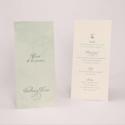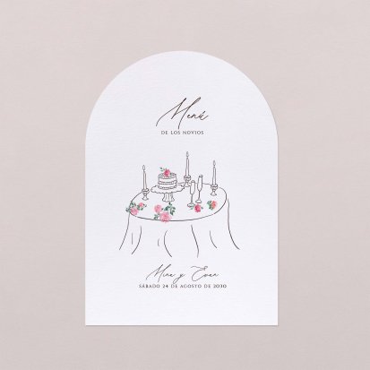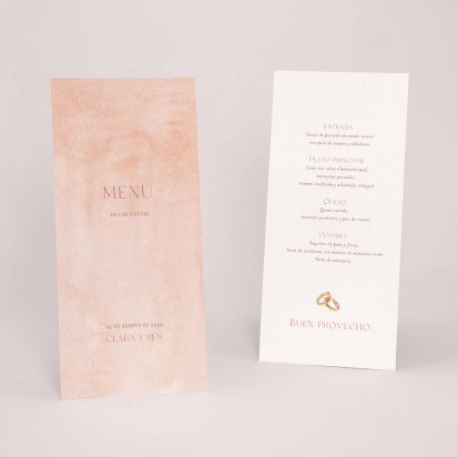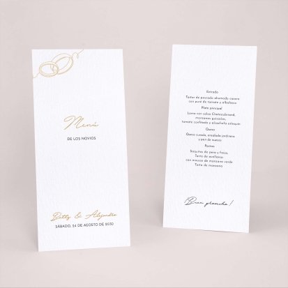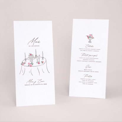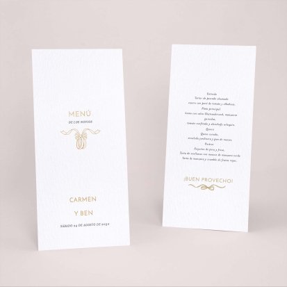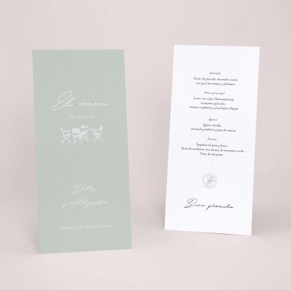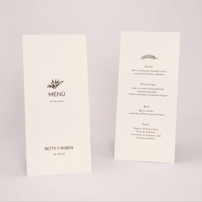 Una vez decidido el menú de tu boda. Imprímelo a juego con tu invitación de boda. Presentados en las mesas, completarán de forma ideal la decoración y vuestros invitados, se llevarán un bonito recuerdo de vuestro convite. Os aconsejamos un menú por persona: puedes colocarlo en el centro del plato junto con el marca sitio.