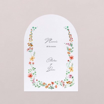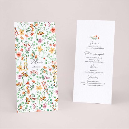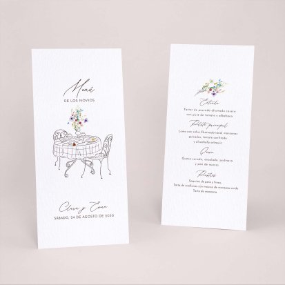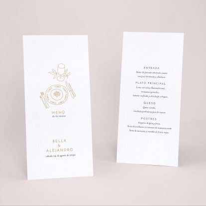 Una vez decidido el menú de tu boda. Imprímelo a juego con tu invitación de boda. Presentados en las mesas, completarán de forma ideal la decoración y vuestros invitados, se llevarán un bonito recuerdo de vuestro convite. Os aconsejamos un menú por persona: puedes colocarlo en el centro del plato junto con el marca sitio.