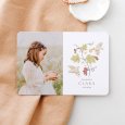 En la invitación personalizada Pequeña Vid las palomas traen la feliz noticia: ¡La Comunión de tu hijo va a ser celebrada! Ilustrada con ternura y resaltada con la foto de tu elección, esta invitación seguro que encantará a tus invitados.