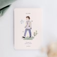 En la invitación Peregrino tu niño se dirige todo elegante a celebrar su Comunión con una paloma volando cerca de él. Este modelo ilustrado con ternura encantará a todos tus invitados.