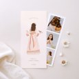 ilustrada con la imagen de tu pequeña, la tarjeta de anuncio Mensajera II anuncia con delicadeza la Comunión que se va a celebrar. Con sus tonos pastel y toques dorados, este diseño encantará a sus invitados.