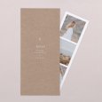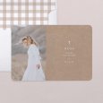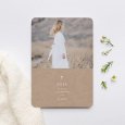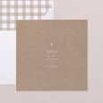 Sobre un fondo elegante y sobrio kraft, el recuerdo de Comunión Natan decorado con una simbólica cruz blanca, que presagia la ceremonia que está por llegar. Este modelo puede ser personalizado con una bella fotografía de tu peque.