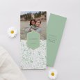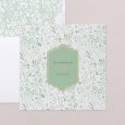 Muchas flores de primavera en tono verde decoradas con delicados toque en oro para la invitación de comunión Amanda, ideal para una celebración en primavera o en verano.