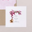 En la invitación de boda Bougainvillée, el hermoso arbusto de colores vibrantes que le da nombre se ilustra sobre los nombres de los novios, un sutil homenaje a una boda de verano celebrada en el Mediterráneo.