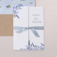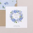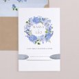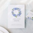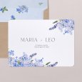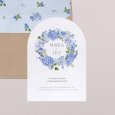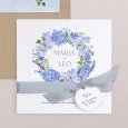 El imprescindible tema floral se reinventa con modernidad en la invitación de boda Hortense. Una hermosa corona de flores en tonos azules se dibuja en esta creación, perfecta para marcar el tono de una boda campestre chic y colorida.