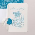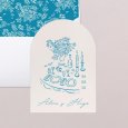El formato de esta invitación es un díptico vertical. Sus bordes redondeados suavizan su corte clásico. Viene acompañado de una etiqueta redonda personalizada que se puede atar con un bonito cordón o un lazo (propuesto como accesorio a comprar aparte).