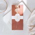 Una invitación elegante con fondo terracota y toques en acabado oro, el modelo María Luisa para anunciar vuestro enlace. Para completar el efecto elegante os sugerimos la flor seca Broom blanco (propuesta como accesorio).