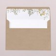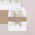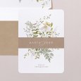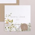 Un ramo de flores silvestres y hierbas ilustrado sobre la invitación Arpèges. Con detalles en fondo color kraft combinados con una tipografía elegante que completan está composición de estilo bucólico. Una invitación ideal para una boda de estilo natural chic.