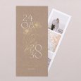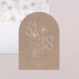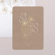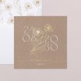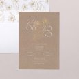 El día de vuestra boda es el centro de atención en la invitación Ofelia. El papel efecto kraft y una ilustración floral en acabado oro protagonizan este modelo, perfecto para quienes sueñan con un “sí” en una atmósfera campestre, natural o ligeramente vintage.