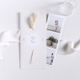 Esta invitación de boda está compuesta por una tarjeta alargada en forma de díptico y un marca páginas en el interior que quedará sujeto por unas hendiduras.
