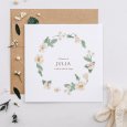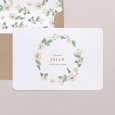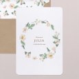 Una preciosa corona de flores blancas decora la invitación Rosa blanca. Un modelo lleno de frescura, perfecto para una ceremonia primaveral o estival.