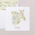 En la invitación de bautizo Dulce mensajero una paloma anuncia el bonito evento. Un símbolo tradicional con un toque original, un plumaje decorado de flores blancas y ramas de olivo.