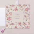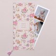 Anuncia el bautizo de tu hijo con estilo y encanto con la invitación Julietta. El nombre de tu pequeño destaca en letras doradas, adornado por un marco de flores en tonos rosados.