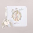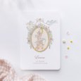 Un universo fantástico en tonos pastel se dibuja en la invitación de bautizo Medallón Encantado. Un unicornio alado, una jirafa, un elefante, un zorro y otros encantadores mensajeros se reúnen en esta creación de encanto vintage, anunciando con infinita ternura el bautizo de su pequeña niña o niño.