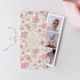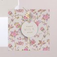 Esta invitación de bautizo, hecha con papel de calidad superior, es un díptico cuadrado que también incluye en el interior 4 fotos, además de una etiqueta con el nombre y la fecha, un recuerdo para vuestros familiares y amigos. Para colocar las flores pasa los tallos por las dos perforaciones de la tarjeta.