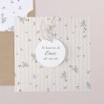 Las flores azules de myosotis decoran la invitación Myosotis. Un toque poético con su fondo de delicadas líneas verticales para anunciar el bautizo de tu pequeño en primavera o en verano.