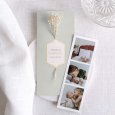 Esta invitación de bautizo, hecha con papel de calidad superior, es un díptico cuadrado que también incluye en el interior 4 fotos, además de una etiqueta con el nombre y la fecha, un recuerdo para vuestros familiares y amigos. La recibirás con las aberturas perforadas preparadas para decorarlo con flores. Coloca las flores pasando los tallos por las dos perforaciones de la tarjeta.En caso de no querer flores deberás elegir un modelo sin aberturas.