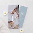 En la tarjeta de bautizo Daphné - azul, la inicial del nombre de tu hijo se posa delicadamente sobre su más bella fotografía. Un modelo minimalista, que compartirá con sencillez el bautizo de tu hijo.