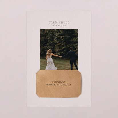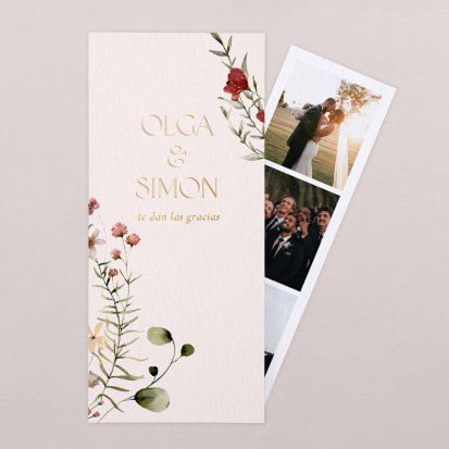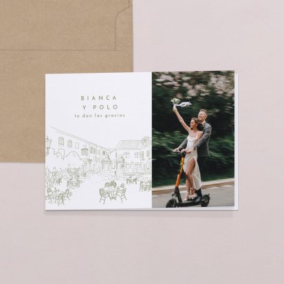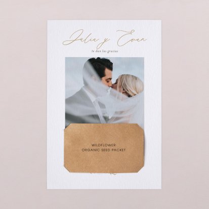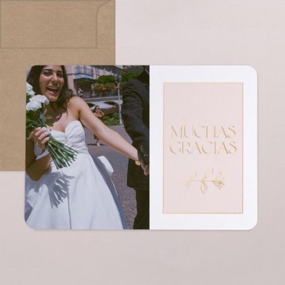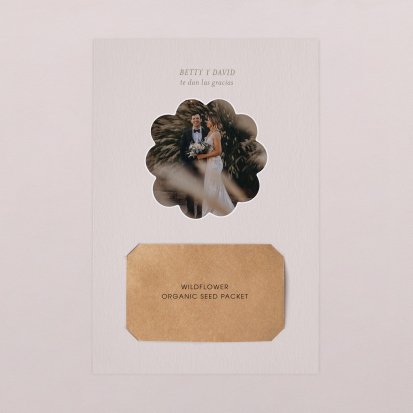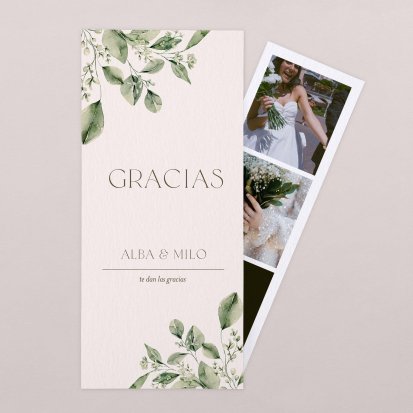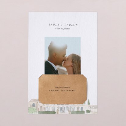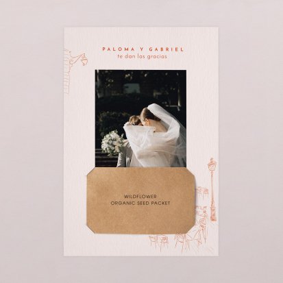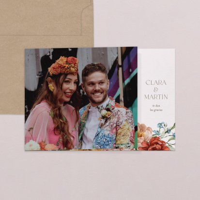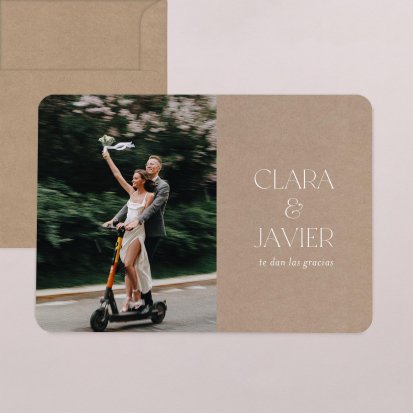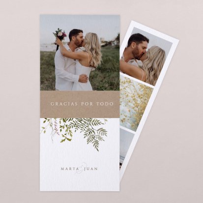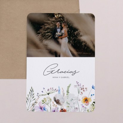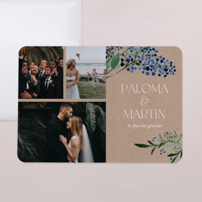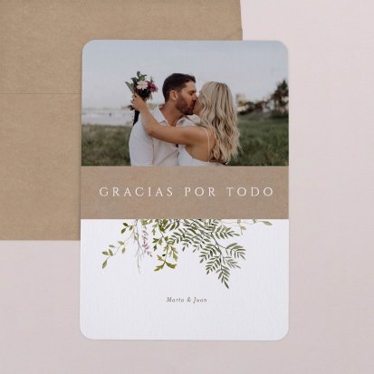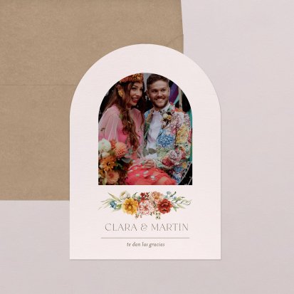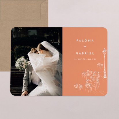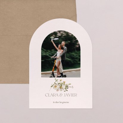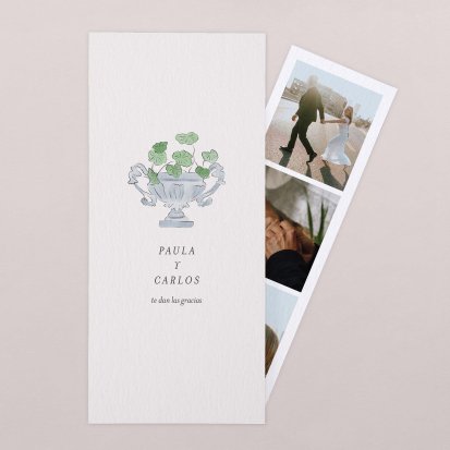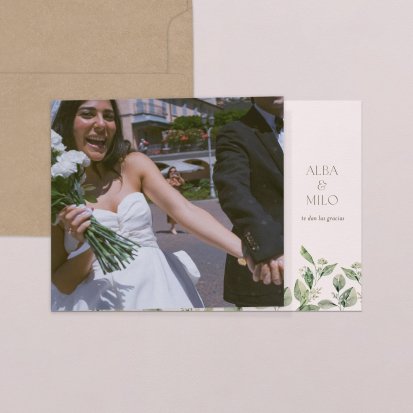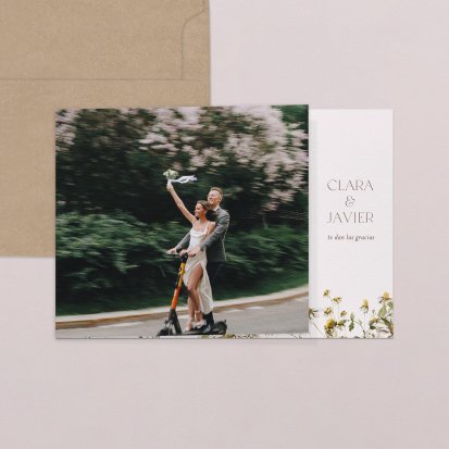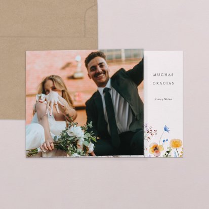Es decir, te ofrecemos una idea que luego puedes modificar a placer hasta convertir tu tarjeta de agradecimiento a los invitados de tu boda en lo que prefieras. Añade una fotografía, cambia la tipografía, emplea los colores que hayas escogido para las invitaciones de boda y para toda la cartelería de la ceremonia, también disponibles en Cotton Bird, y transforma la tarjeta en el punto final de una jornada tan festiva como inolvidable.