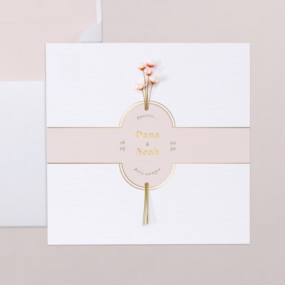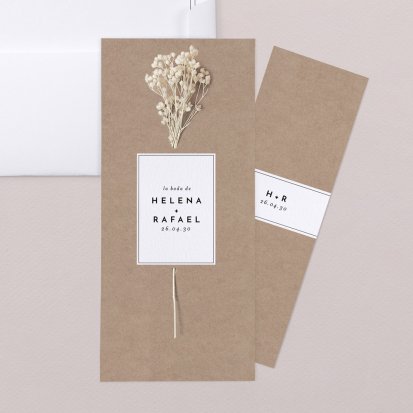 Dependiendo del tipo de modelo de la invitación de boda, también puede incluir una cubierta de papel vegetal doblado en tres partes, para proteger el pequeño arreglo floral. Igualmente, se puede sumar un sticker personalizado para pegar y mantener las flores en su sitio y lograr diseños minimalistas insuperables como en los modelos Olga III o Eugenia.