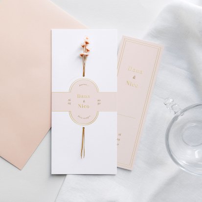 La selección de tipo de flor o arreglo natural también debe ir en función al tipo de invitación. Si planeas una invitación en gran formato (9,5x21 cm o 15x21 cm) lo mejor es incluir una flor no tan pequeña, tal vez un par de lagurus, como los que se destacan en el modelo Gemma III; o unas hermosas espigas doradas, como las que presenta el modelo Olga.