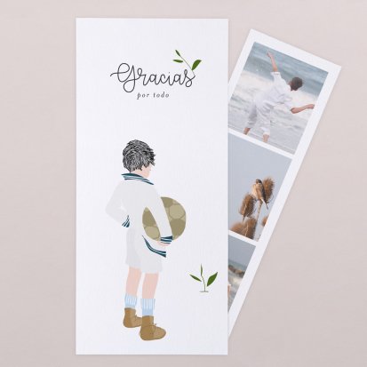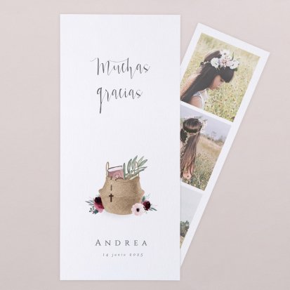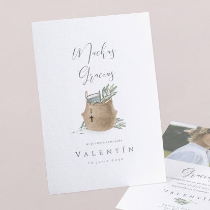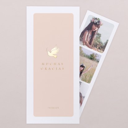 Cuando hablamos de originalidad nos referimos a las múltiples posibilidades de personalización que pueden encontrarse en nuestra plataforma. Hay diseños que incluyen una fotografía del niño o de la niña por una cara y un mensaje de agradecimiento por la otra. En otros casos, se puede emplear el mismo fondo que se escoja para otros artículos como las etiquetas personalizadas de primera comunión, también disponibles en nuestra web.