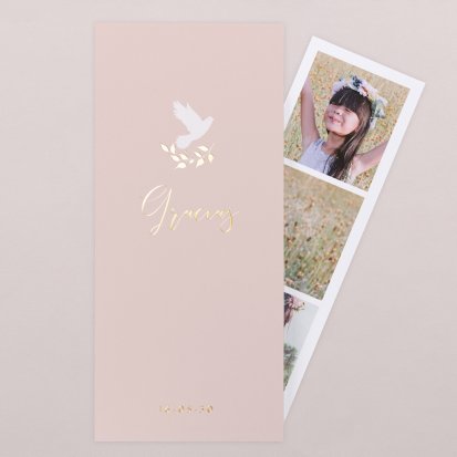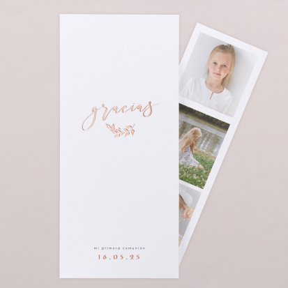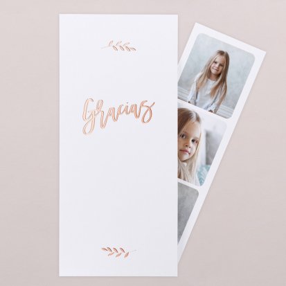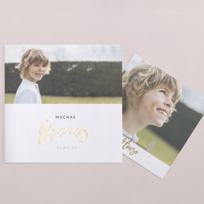 Al acceder a la página web basta con buscar tarjeta de agradecimiento de primera comunión en el menú superior y revisar los modelos disponibles. Tras hacer clic en el que más te guste, podrás personalizarlo subiendo una fotografía, seleccionando la tipografía e incluso los acabados.
