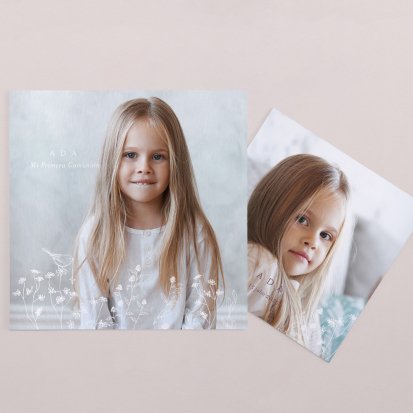 Dividimos nuestra oferta en dos grandes grupos. El primero consiste en las tarjetas de invitación a la primera comunión. Su tamaño es de 10,7 x 15,5 centímetros, son personalizables y puedes aprovechar el espacio para insertar un pequeño texto en el que incluya el correspondiente agradecimiento por la atención prestada.